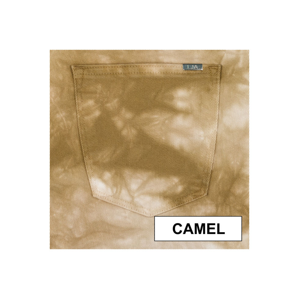Pantalona de Sarja estampada com cor única. Aperta com fecho e botão. Têm 5 bolsos.